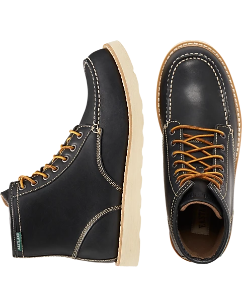 Crafted from supple, full-grain leather, these Eastland boots feature triple reinforced hand-stitching along the moc toe and throughout for increased durability. A cushioned footbed and mini-groove design on the lightweight, wedged sole ensure flexibility and all-day comfort. Ready for both work and the weekend, they can be worn with jeans, chinos, or cargo pants.