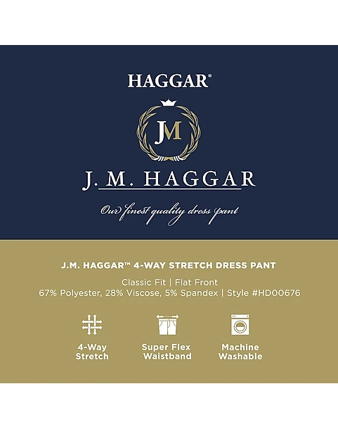 Whether you’re stepping into the office or out on the weekend, these J. M. Haggar dress pants fit your needs perfectly. The pants offer exceptional style, quality, and flexibility for you and your wardrobe. Made from the finest fabric with stretch built right into the fibers for comfort all day long.