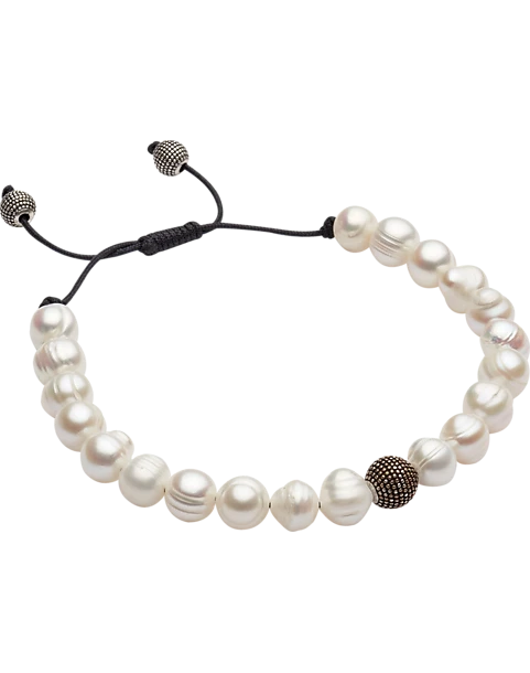 Gleaming white, freshwater pearls elegantly adorn this cool bracelet from Pronto Uomo. Fashioned with an adjustable pull cord and accented with brass beads, it will be a contemporary addition to your ensemble.